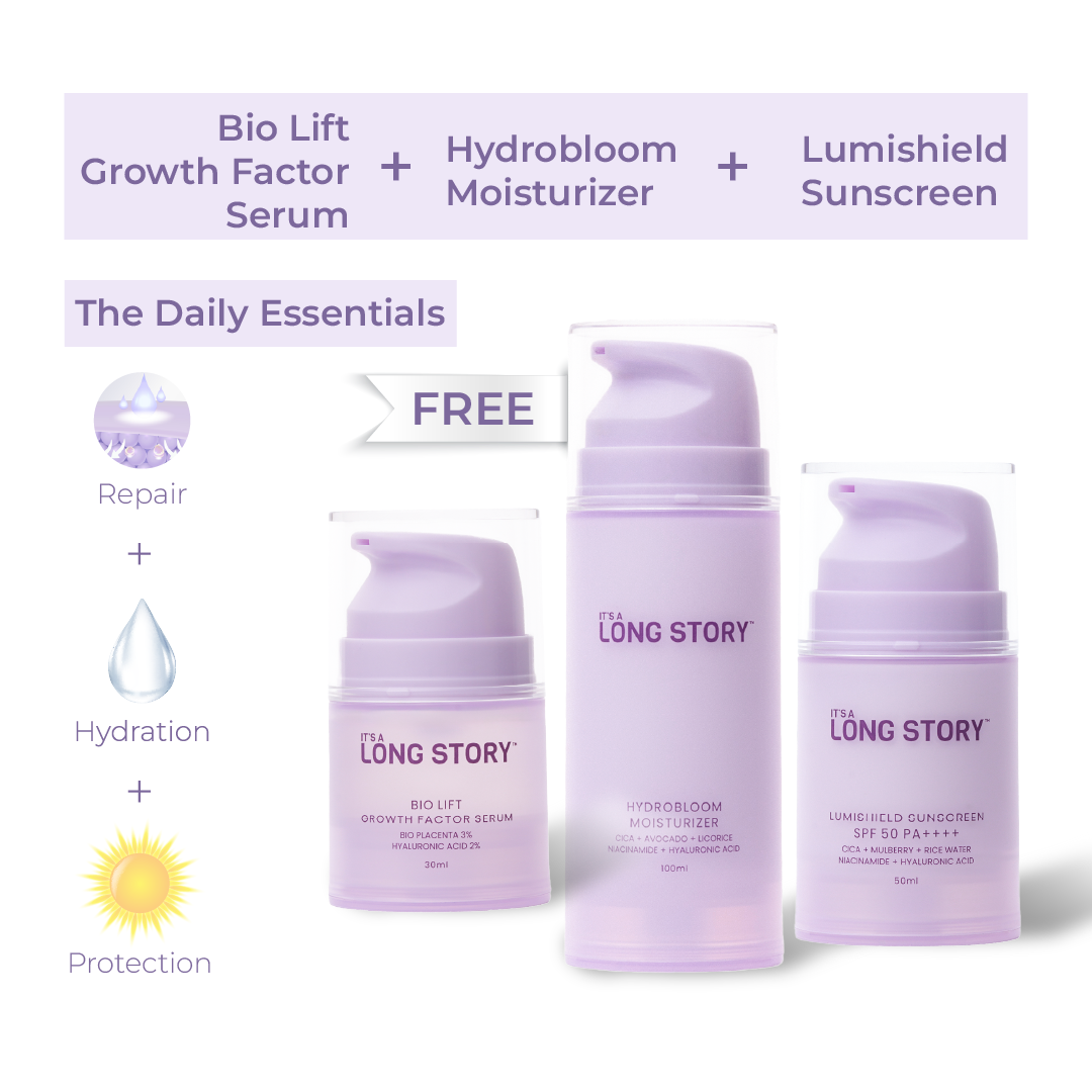 - COMPLETE SKINCARE COMBO: Includes Bio Lift Growth Factor Face Serum (30ml), Hydrobloom Face Moisturizer (100ml), and Lumishield SPF 50++++ Face Sunscreen (50ml)